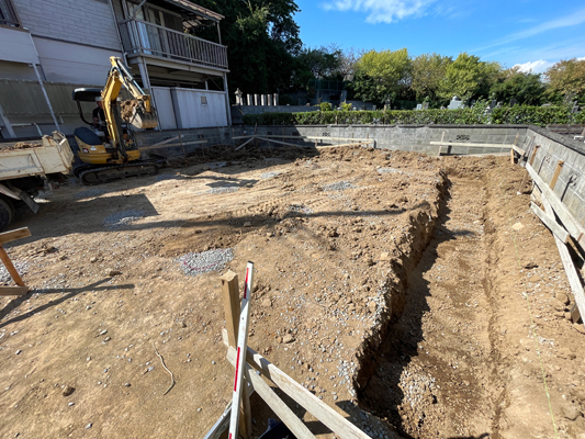 先日の地盤改良工事を経て、丁張り及び遣り方(建物の位置や基礎の高さや深さを木の貫材などで囲い示す工事)を確認し、掘削工事が進んでいます。