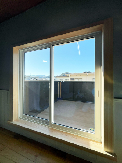 室内側の窓台(窓枠の下部のこと)も腰が掛けられるよう、ベンチ風に大工職につくってもらいました。
