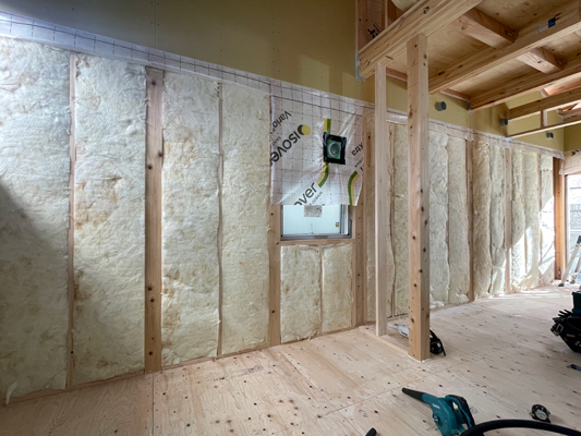 壁の断熱工事が進んでいます。仕様はマグ・イゾベール コンフォートを採用。袋なしグラスウール材というのが特徴で、適度なコシがあり壁体内にしっかりと入れ込むことができる断熱材となります。