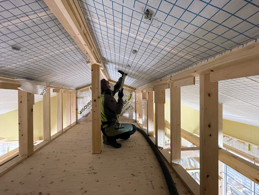屋根断熱工事を向かえることができました。セルロースファイバーを素材としたブローイング工法による断熱工事となります。