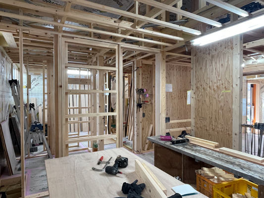 室内空間を仕切る下地組みもかたちとなって表れてきました。