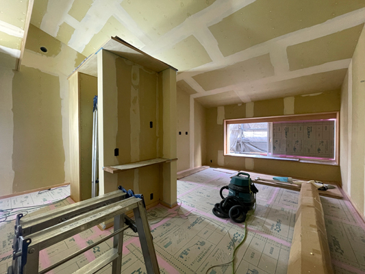 建物内の工事も木工事から内装工事へとバトンタッチ。無垢木部を自然塗料で施し、天井面や壁面の下地パテ処理へと工事が進みます。