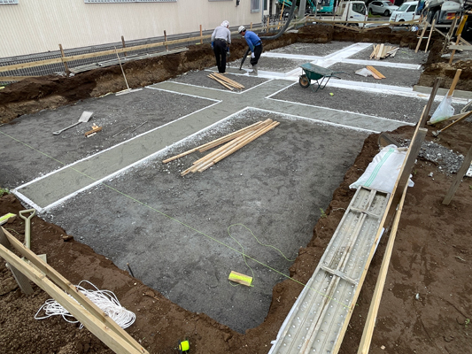 後方に写る白い部材は、基礎地中梁ライン下部に敷設されるEPS材。今日はその上から厚さ100ミリの調整コンクリートを打設しました。